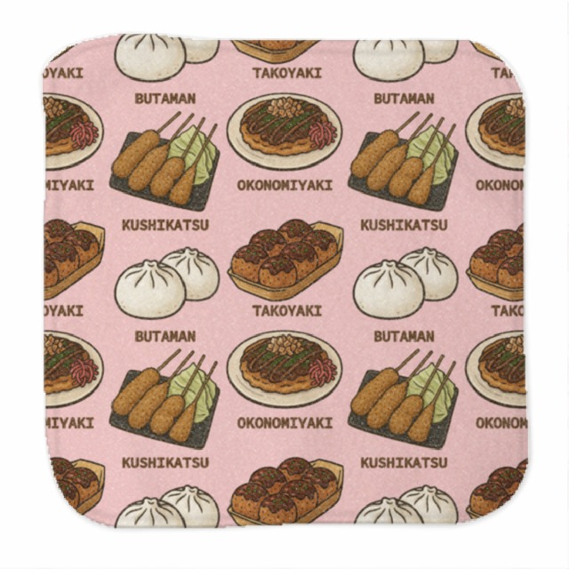 大阪グルメ総柄ミニタオル【たこ焼き・お好み焼き・串カツ・豚まん】20×20cm