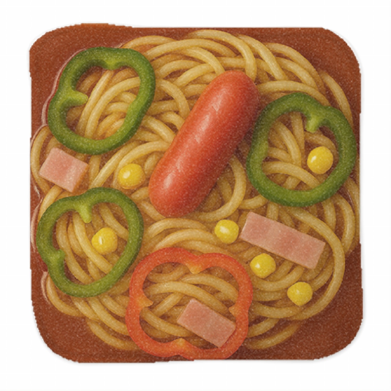 太麺にピリ辛あんかけソース、そしてウインナー・ピーマン・コーン・ハムまでしっかりプリント。見た目はアツアツですが――やけどの心配はゼロ、ご安心ください。