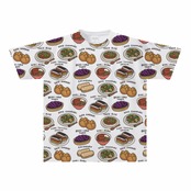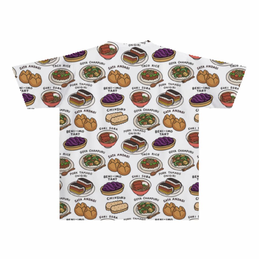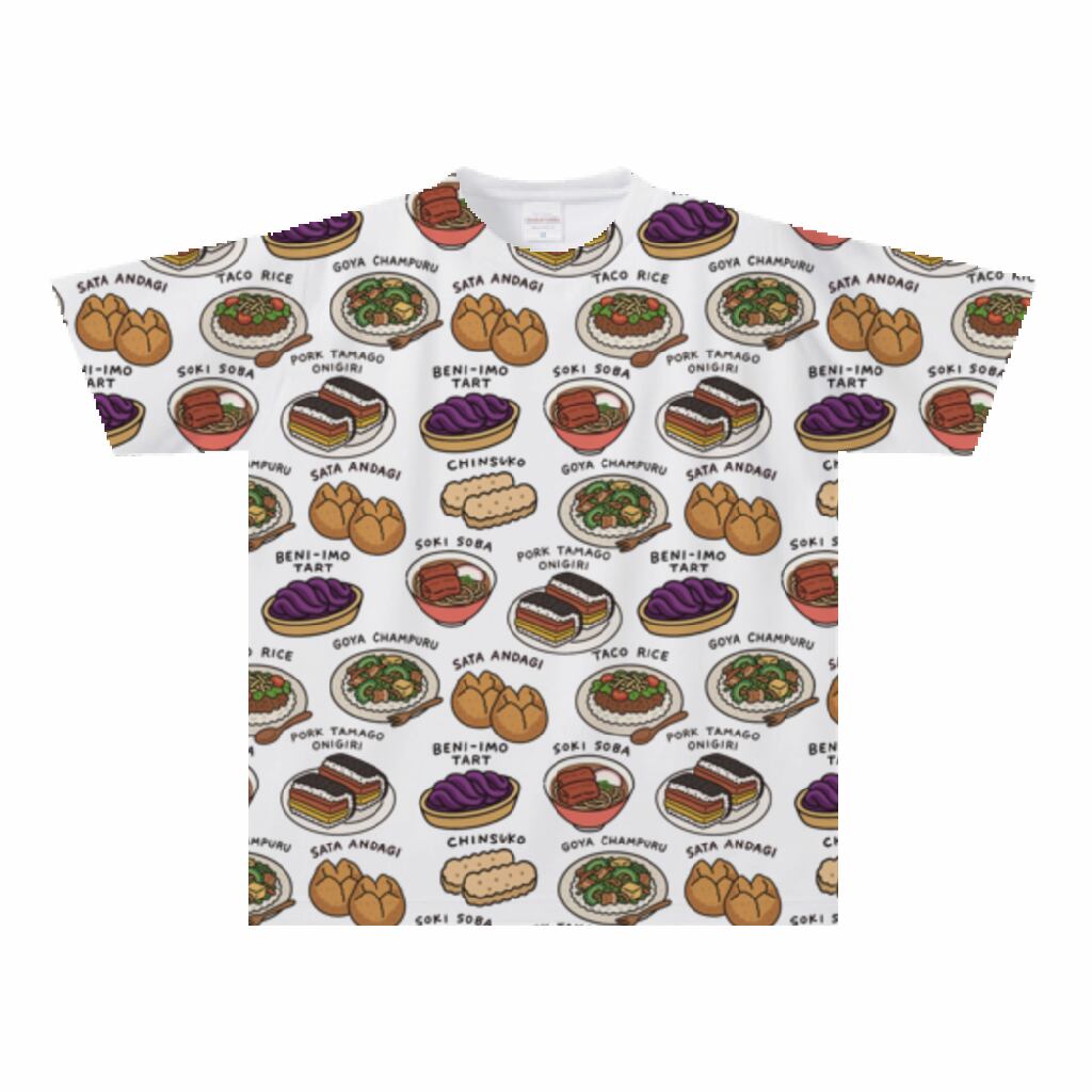 沖縄の人気グルメが これでもか! と詰め込まれた総柄ドライTシャツです。