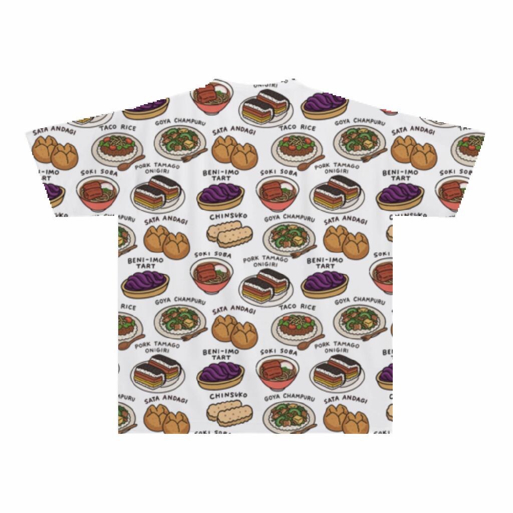 沖縄の人気グルメが これでもか! と詰め込まれた総柄ドライTシャツです。