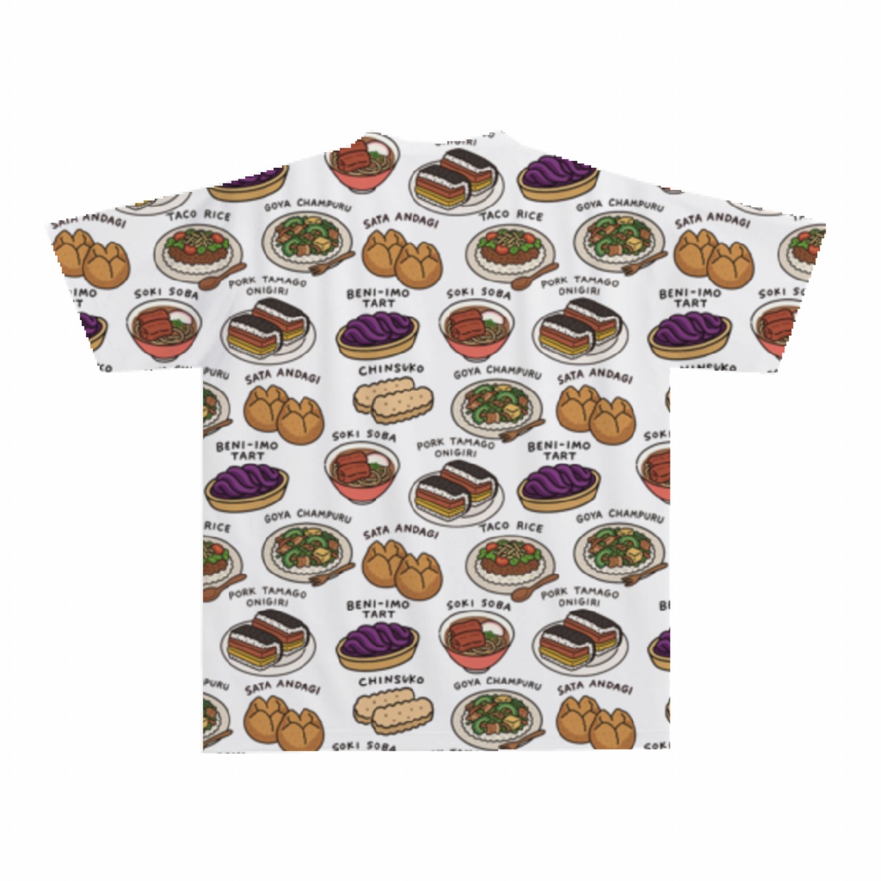沖縄の人気グルメが これでもか! と詰め込まれた総柄ドライTシャツです。