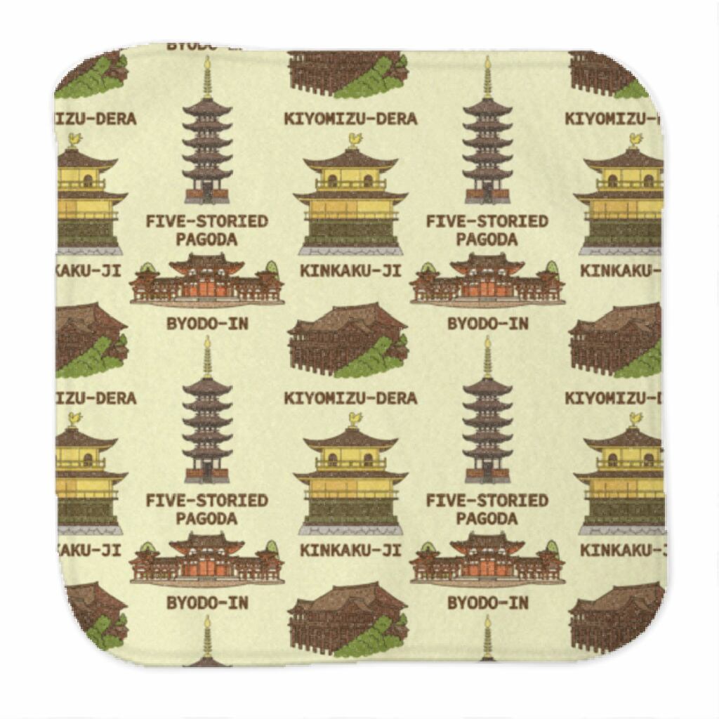 京都名所ミニタオル【清水寺・金閣寺・平等院・五重塔 総柄】